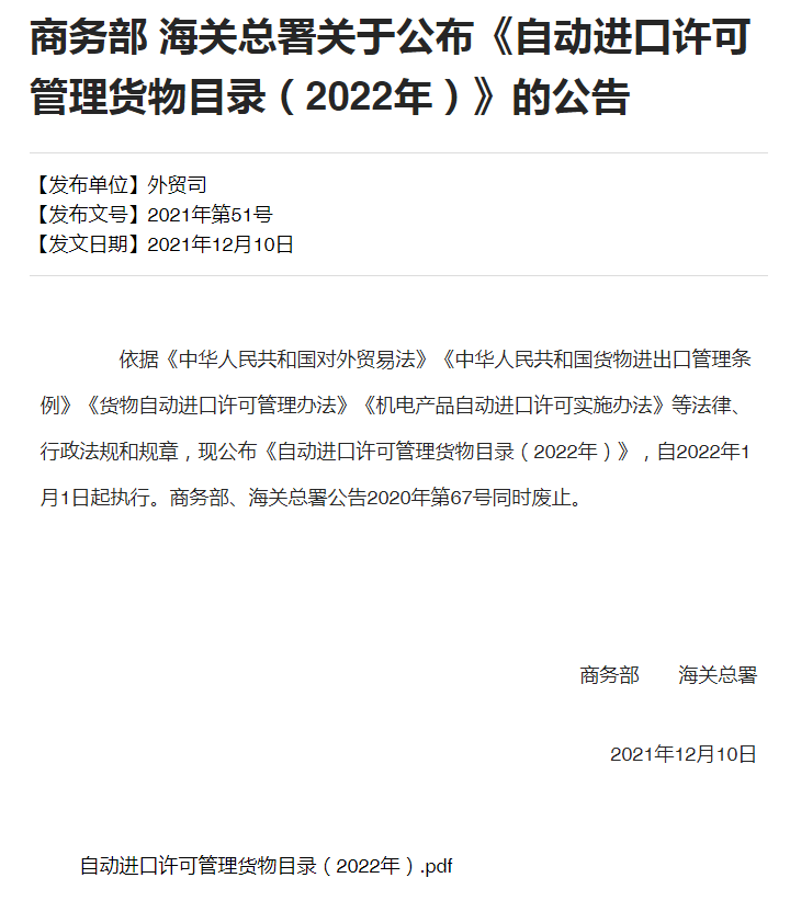 自動(dòng)進(jìn)口許可管理貨物目錄由商務(wù)部會(huì)同海關(guān)總署等有關(guān)部門(mén)制定、調(diào)整和公布。