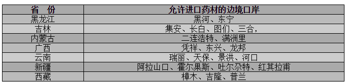 黑龍江省黑河、東寧,吉林省集安、長白、圖們、三合,內(nèi)蒙古自治區(qū)二連浩特、滿洲里,廣西壯族自治區(qū)憑祥、東興、龍邦,云南省瑞麗、天保、景洪、河口,新疆維吾爾自治區(qū)阿拉山口、霍爾果斯、吐爾尕特、紅其拉甫,西藏自治區(qū)樟木、吉隆、普蘭等共22個邊境口岸作為中藥材進口通關(guān)口岸。